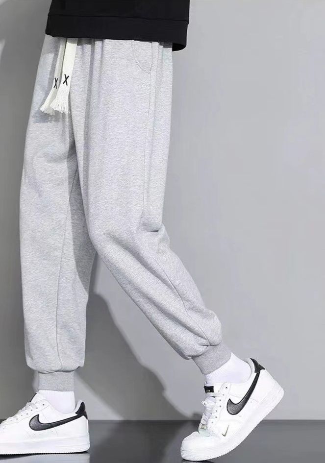 ウエストのタッセル付き調整紐がアクセントになり、リブ仕様の裾がすっきりとした印象を与えます。