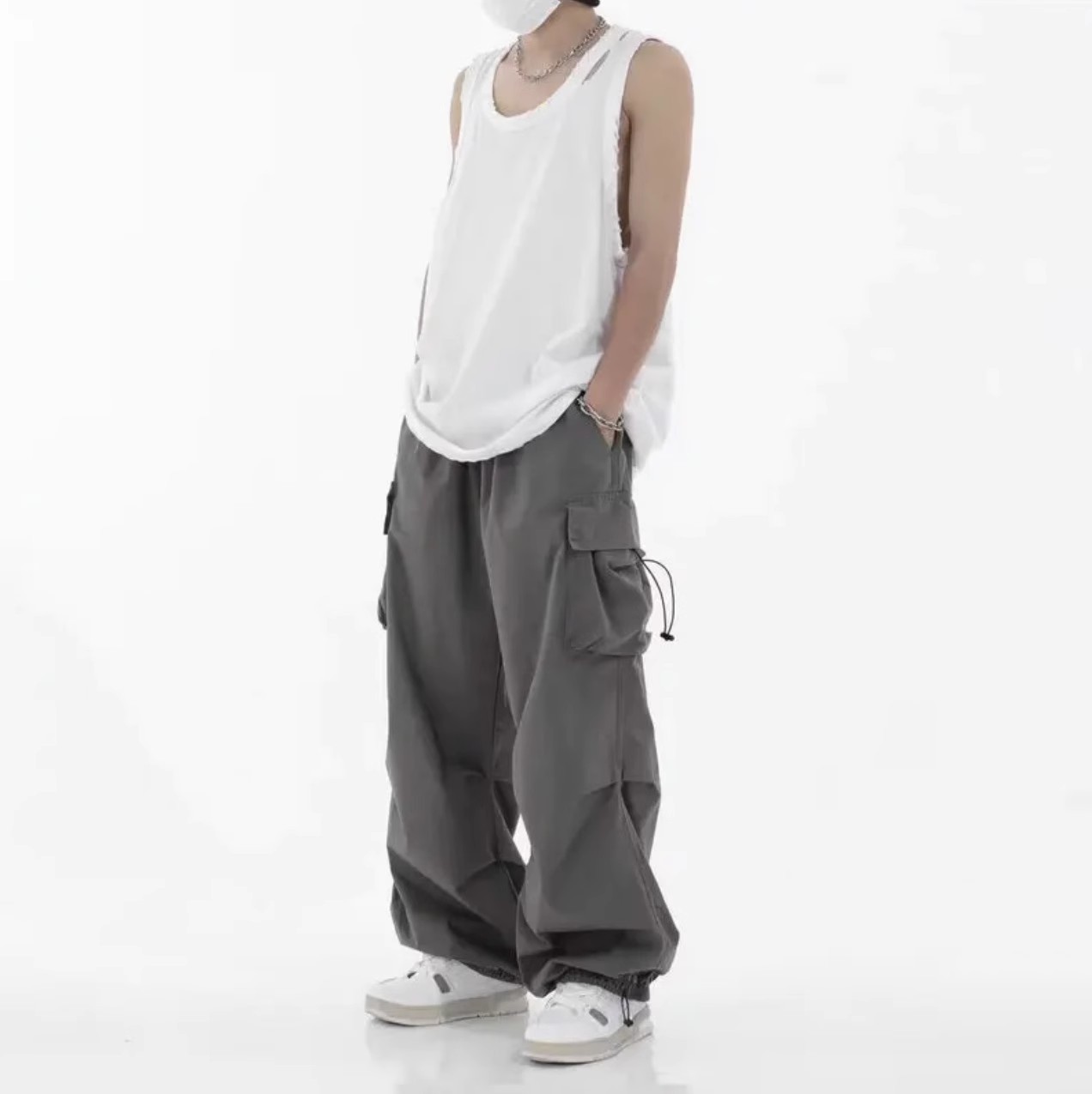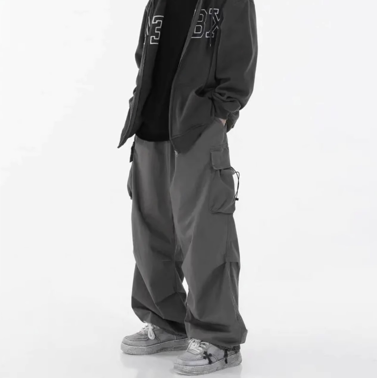 ゆったりとしたワイドシルエットで快適な穿き心地を実現し、グレー パンツならではの合わせやすさで様々なコーディネートに対応します。